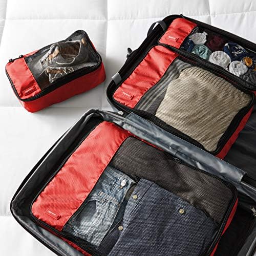 El juego incluye 1 bolsa de equipaje grande de 44,5 x 32,4 x 8,25 cm, 1 mediana de 34,9 x 24,7 x 7,6 cm, 1 pequeña 27,9 x 17,15 x 7,6 cm, y 1 alargada 35,6 x 12,7 x 7,1 cm de Amazon Basics.
