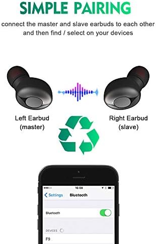 Elija 2 auriculares de la caja de carga. Se conectarán entre sí automáticamente, luego, solo un paso ingrese fácilmente la configuración de Bluetooth del teléfono móvil, elija «F9» para emparejar los auriculares. Se volverá a conectar al teléfono automáticamente cuando retire los auriculares del estuche después del emparejamiento inicial.