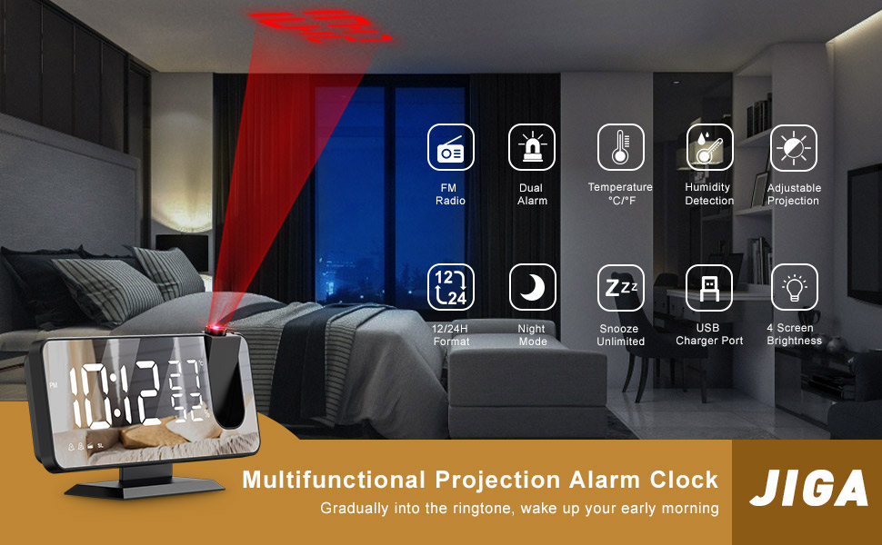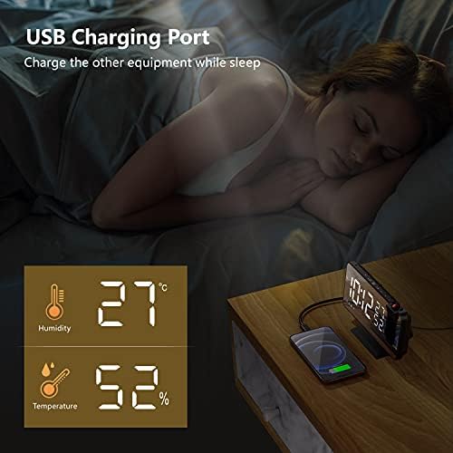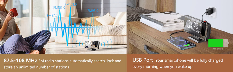 [Puertos de carga USB dobles & Respaldo de batería]: Equipado con una interfaz de salida USB de 5V / 1,2A, puede cargar móviles mientras duerme. La función de proyección funciona solo a través de la alimentación de corriente alterna. El despertador tiene una batería de respaldo incorporada, la configuración de hora / alarma / radio no se afectará incluso si tiene un corto circuito.