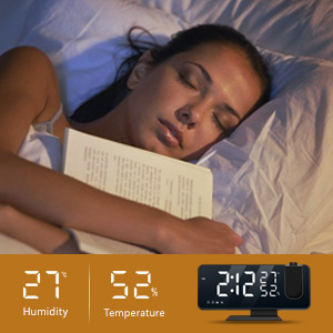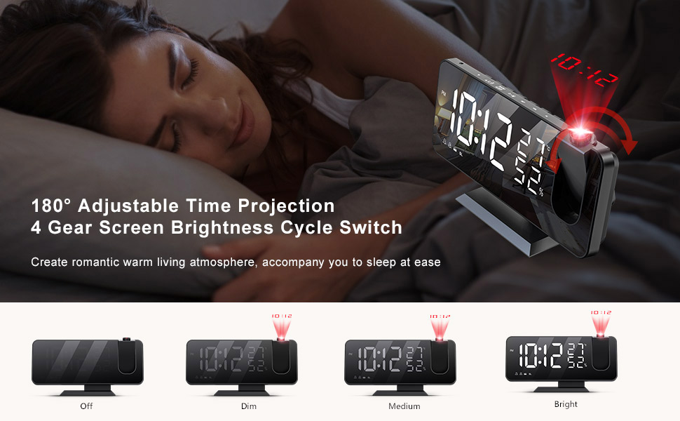 [Proyección Ultra Clara]: Pulse el botón «Proyectar» para proyectar un reloj de ultra claro en el techo o la pared dentro del rango de 0,5-3 m. La proyección puede ser reverenciada por 180 grados para una mejor visualización óptima. Deje la proyección del reloj en el techo por la noche, leerá fácilmente la hora mientras está acostado en la cama.
