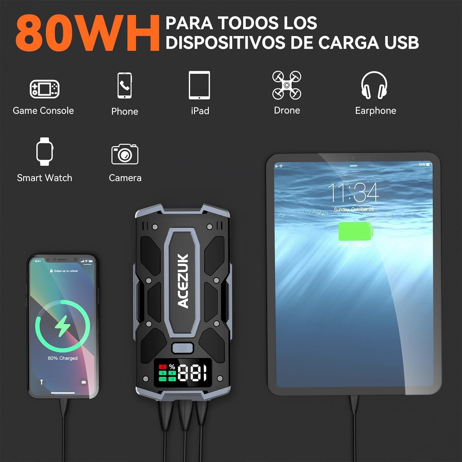 【Luz de Emergencia y Fuente de Alimentación Portátil】Las luces LED incluyen 4 modos (iluminación, SOS, luz estroboscópica, advertencia), que se pueden utilizar para diferentes emergencias. También es un banco de energía portátil de 21800mAh. Gracias a dos puertos de carga USB: USB normal (5V/2.4A), USB3.0 (5V/3A, 9V/2A, 12V/1.5A). Puede cargar dos dispositivos al mismo tiempo, como tu celular, computadora, tablet, Kindle, etc.