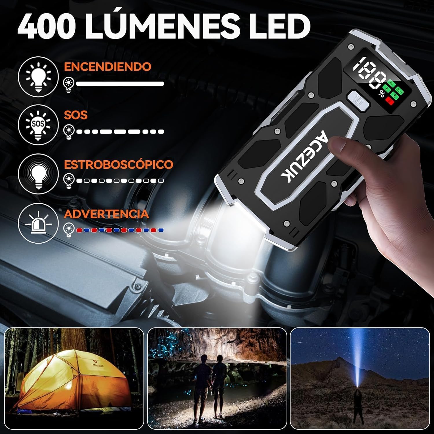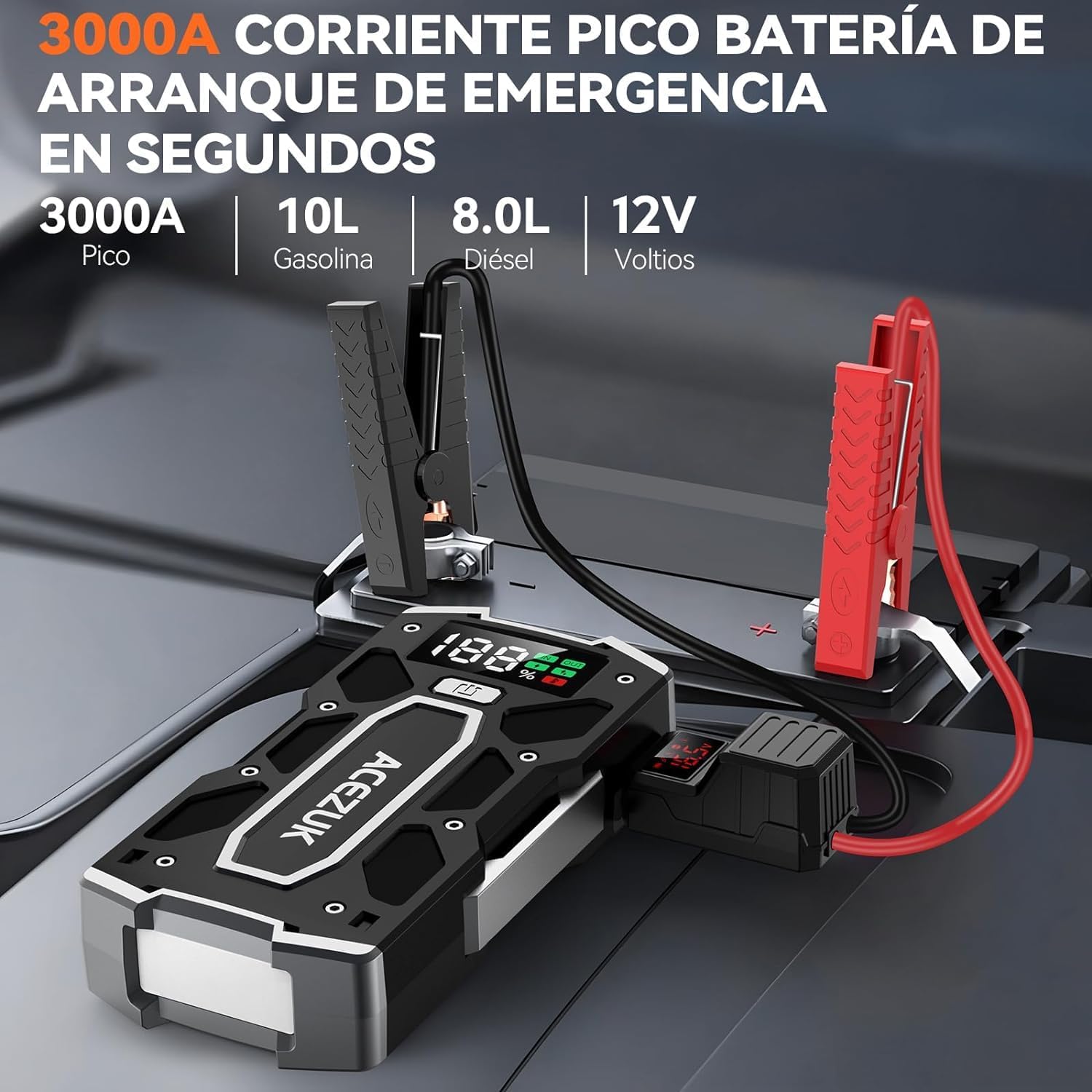 Write a description in Spanish about ACEZUK Arrancador de Coches 6000A, Arrancadores de Bateria de Coche Portátil(hasta 8.0L de diésel o 10.0L de Gasolina), 12V Jump Starter, Pinzas Inteligentes con Pantalla, Luz LED, Puerto QC3.0 and account so that it can be used in a humorous tone