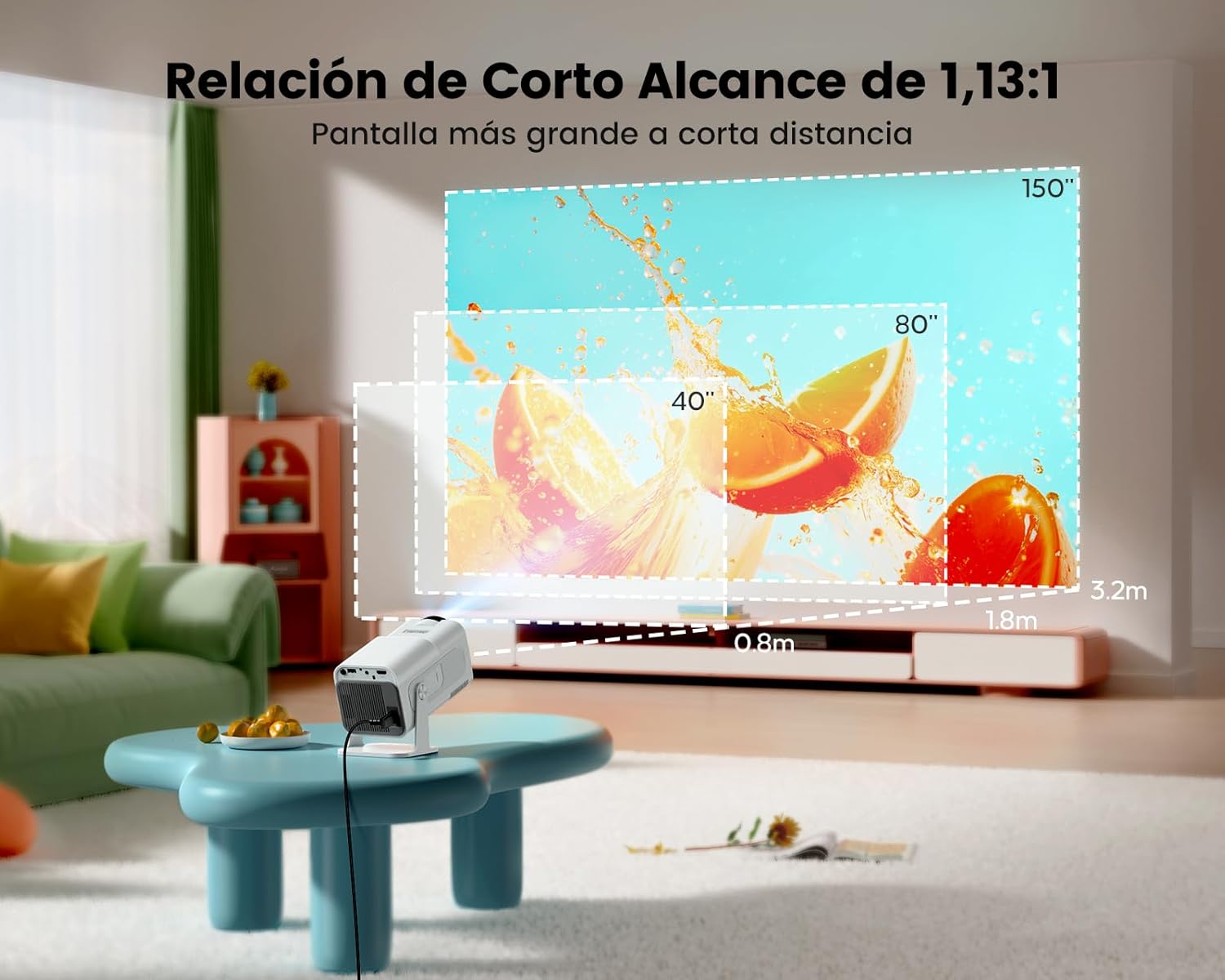 【 Relación de Proyección 1,13:1 & Zoom 80%-100%.】Este proyector portátil tiene una relación de proyección de 1,13:1, lo que permite proyectar pantallas de entre 40 y 200 pulgadas a corta distancia (entre 1 y 3,6 metros). Con la posibilidad de reducir la imagen del 100% al 80% mediante el mando a distancia, no tendrás que mover el mini proyector portatil soporte podrás disfrutar de una noche de cine en la comodidad de un espacio amplio como un loft, un dormitorio, una caravana, etc.