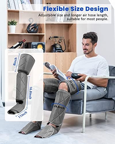 【Envoltura ajustable para adaptarse a cualquier tamaño】este masajeador de pies y piernas le permite cambiar de tamaño fácilmente con las correas de velcro. La venda de las pantorrillas mide hasta 24,8 pulgadas de circunferencia y los muslos hasta 33,5 pulgadas de circunferencia. Se adapta a piernas de cualquier tamaño.