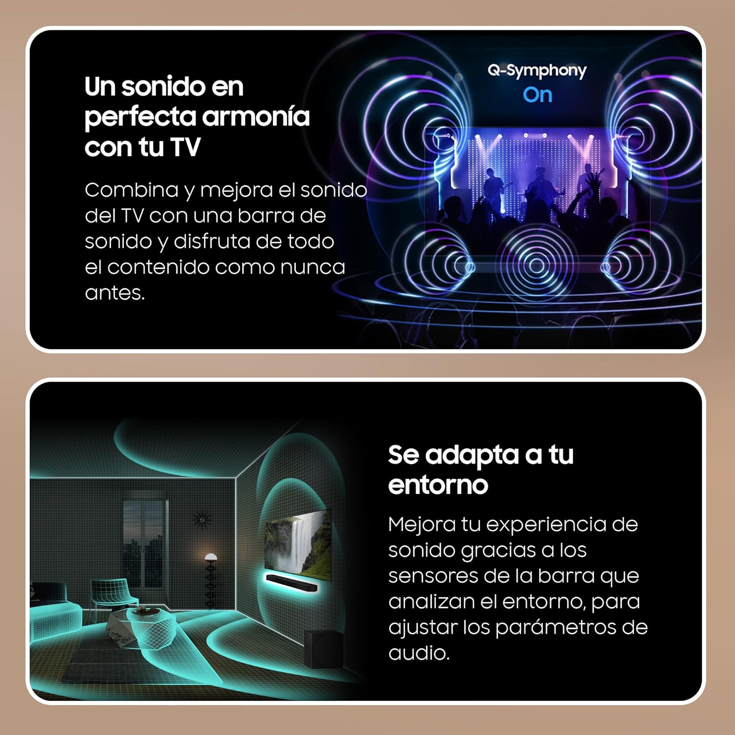 Q-Symphony: Disfruta de todos los altavoces a la vez. Esta tecnología exclusiva de Samsung combina el sonido del TV con la barra de sonido, sin anular ninguno.