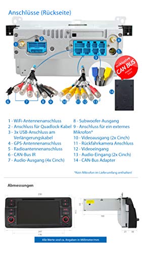 Norma DIN uno (1DIN) + Cámara de visión trasera IN, Subwoofer OUT, Mando a distancia del volante + Volumen de entrega: antena GPS y WiFi, CANBUS