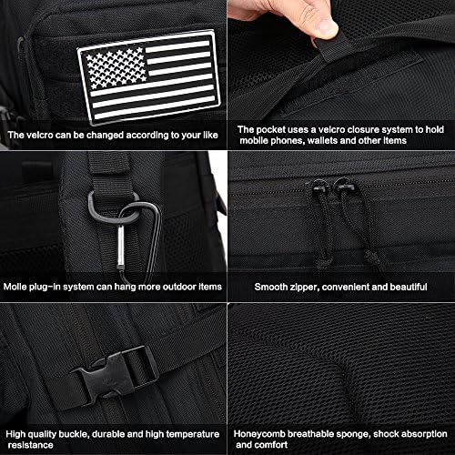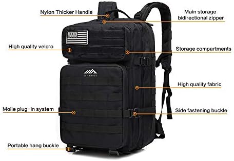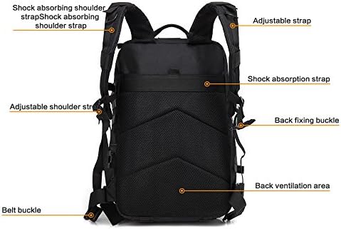 Cómodo de Llevar y Usar – El paquete de asalto tiene costuras dobles, cremalleras de uso pesado y tiradores de cordón estilo utilitario, correas de hombro acolchadas cómodas y área posterior con respaldo de malla para mayor comodidad, ventilación y resistencia durante el transporte. Correas de cintura ajustables para evitar que la correa de la cintura se suelte por las hebillas